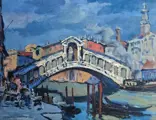 Olieverf op doek met voorstelling van Venetië, gesigneerd A.Sdruscia '47 linksonder.