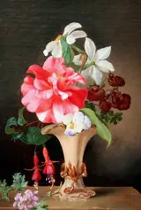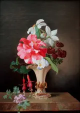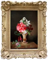 Fraai stilleven met bloemen in een porseleinen vaas werd ca. in 1860 door de Weense bloemen- en stillevenschilderes Adele Schuster, die de dochter en leerling was van haar vader, de beroemde stillevenschilder Josef Schuster (1812-1890) en vanwege het Oostenrijkse lexicon van H.Fuchs actief was in Wenen in de tweede helft 19e eeuw. Ze schilderde in de stijl van haar vader. Dit schilderij is vroeg werk van Adele in die tijd, aangezien ze door vader bestudeerde en haar bloemenschilderijen signeerde met alleen de voornaam. Er zijn maar weinig bloemenwerken van haar verkocht op verschillende internationale veilingen: Dorotheum, Wenen, Bonhams en Christies, beide in Londen.