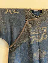 Prachtige antieke zijden kamerjas uit China in blauw/bruine kleuren. Rijkelijk geborduurd en in zeer goede staat.