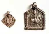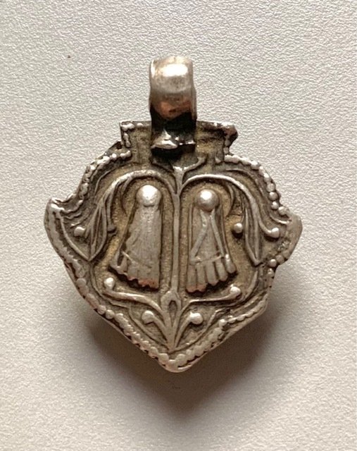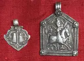 2) Amulet van Ramdev(a) = Ramdeoji. Ramdeva was een 14de eeuwse Rajasthan heerser die opkwam voor de laagste kasten en mensen in behoeftige omstandigheden. Hij is een vergoddelijkte held.