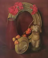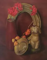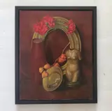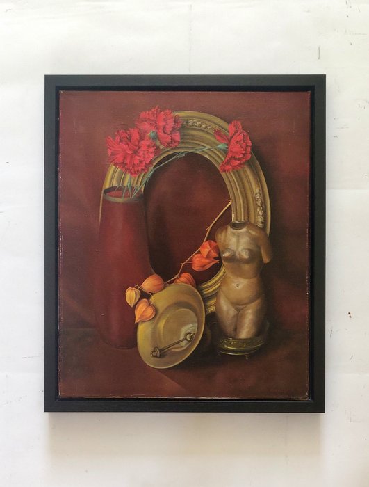 Stilleven met bloemen, ronde lijst en beeld van André Verhelst (1947) in luxe zwarte lijst. Bij het werk wordt een leaflet van de kunstenaar mee geleverd (zie laatste foto)