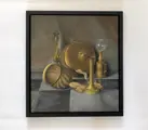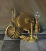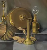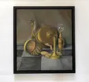 Stilleven met koperen kaars standaarden, gaslamp en bord van André Verhelst (1947) in luxe zwarte lijst. Bij het werk wordt een leaflet van de kunstenaar mee geleverd (zie laatste foto)