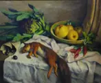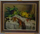 De compositie toont een stilleven van fruit en een eekhoorn (een ongewoon element in stillevens) in het midden onderaan.