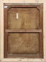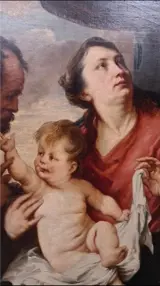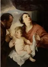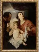 Doekmaat: 127 x 83,8 cm, lijstmaat 138 x 100,7 cm. Het tafereel stelt de Heilige Familie voor.