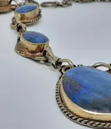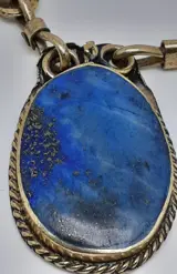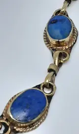 In zilver en lapis lazuli stenen. Het draagt geen kenmerken, ik heb er geen gezien. Het is zuur getest, zilver minder dan 800.