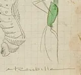 Techniek en ondersteuning: Potlood en waterverf op papier gelamineerd op gekleurd papier