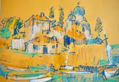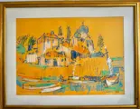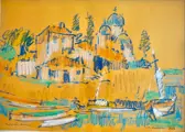 Oost-Europese school (XX), Augustin Costinescu (Roemeens, 1943 - 2021), "Landschap in Griekenland", acryl op dun karton. Gesigneerd en gedateerd in inkt rechtsonder, getiteld in inkt linksonder. Gesigneerd, getiteld, gedateerd, opdracht door kunstenaar in inkt op de achterkant, rechtsboven. Het werk is in een zeer goede staat bewaard gebleven. Het is ingelijst in een eigentijdse lijst als nieuw en beschermd door glas.