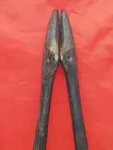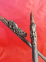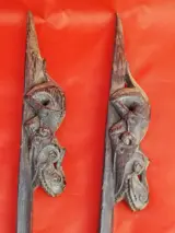 Twee prachtige objecten vormen dit paar voor de ondersteuning van de kralen die deel uitmaken van de Dayak draagdoeken. Deze twee objecten zijn gesneden door de Bahau Dayak-stammen met het Asu-hond/draakmotief, een mythologische figuur met een grote beschermende/spirituele kracht tegen boze geesten. Deze twee steunen met Asu hadden dus verschillende functies om de ziel van het kind te beschermen, de kralenversiering te ondersteunen en de draagzak te verfraaien en status te geven. Ze zijn gemaakt van een stuk tapanghout (Koompassia excelsa). Nog steeds in hun originele patina, komen deze objecten uit een Italiaanse collectie van een antropoloog. Verkocht met ondersteuning en verzending door particuliere koerier.