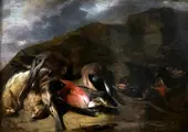 Schitterend oud schilderij, olieverf op paneel met Stilleven met wild. Door het onderwerp en de vormkenmerken kan het doek worden toegeschreven aan een kunstenaar van de Napolitaanse school die nauw verwant was aan de Napolitaanse schilder Baldassarre De Caro (Napels, 1689 - 1750), die leefde tussen 1689 en 1750 en vandaag de dag nog steeds bekend staat als een specialist in spelscènes.