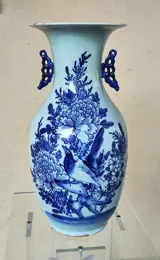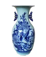 Prachtige Chinese porseleinen vaas gedecoreerd met bloemen en vogels in diepblauw.