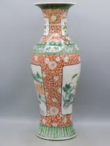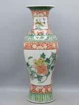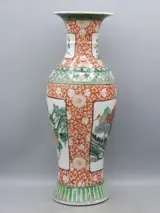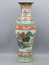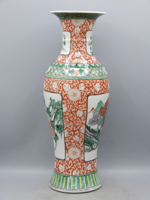 Een porseleinen vaas van goede grootte, in balustervorm, 35,2 cm hoog en 1089 g zwaar, fijn beschilderd in famille verte-email met aan de ene kant een geanimeerd landschap met bergen op de achtergrond, pioenrozen in cartouche aan de andere kant, tussen banden van omgekeerd geschilderde lotus rollen in ijzerrood en banden met geometrische patronen.