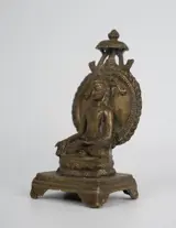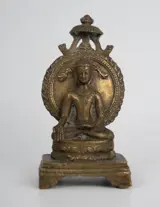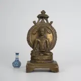 Een mooi antiek Chinees/Tibetaans/Nepalees bronzen beeld, voorstellende een zittende boeddha die een lange gawn draagt met subtiele versiering van gestileerde Chinese karakters en boeddhistisch, fijn gedecoreerd. Uitgevoerd in een mooie kwaliteit brons. De basis is mooi gebeeldhouwd met dubbele lotustroon. Handgemaakt in China/Tibet of Nepal in de 20e eeuw. Aan de onderkant lichte gebruikssporen, die materiaal en leeftijd tonen.