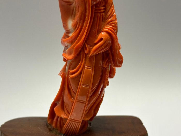 Een prachtig beeldje van Guanyin, gesneden uit bloedkoraal. Dit beeldje is gemaakt van bloedkoraal en heeft een houten standaard.