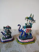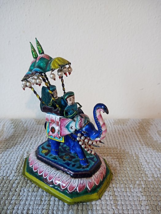 Paar oude Indische olifanten in geëmailleerd zilver met kleine jades. Volledig handgemaakt in zilver bedekt met Menakari-email. Ze stellen een olifant voor met twee chauffeurs (mahout) met een baldakijn