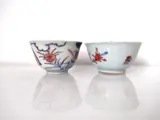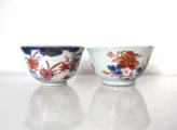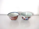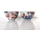 Mooie set van twee kleine "pouch" kopjes in 18e eeuws Chinees porselein, in de Imari stijl. Mooie met de hand geschilderde decoratie bestaande uit bloemen, verschillend op elk, onderglazuur blauwe kleur, gouden accenten.