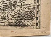 Volledige titel in een kader linksboven, met impressum: 'Nobilis Hannonie Comitat Descriptio Auctore Iacobo Surhonio Montano. Kolonie Formulis Iani Bussemechrs. Anno dij 1596'.