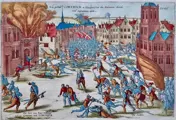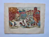 Kortrijk ingenomen door de Malcontenten, 27 februari 1580. Op de markt vechten de Malcontenten met het gelegerde garnizoen Schotten, links op de voorgrond Pottelsbergh, de baljuw van Kortrijk.
