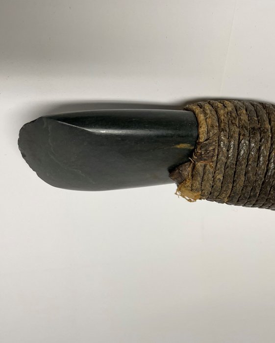 Oude en goed gebruikte dissel/bijl - basaltblad met zeer kleine chips - met uitgebreide sennit binding - oude scheur in disselschacht - geweldige patina