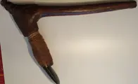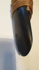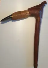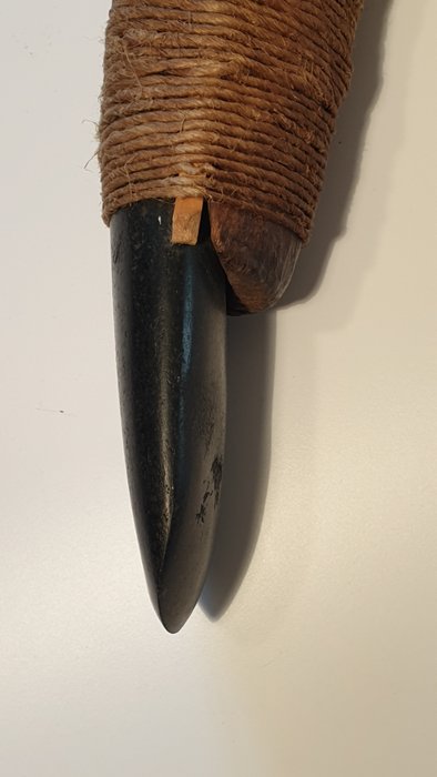 Het gebeeldhouwde houten handvat herbergt een geslepen en gepolijst mes in basaltsteen of zwarte andesiet, typisch voor de oostelijke hooglanden. Bij dit direct passende apparaat is het mes stevig vastgemaakt aan een plaat met rotan strak om de sectie gewikkeld. Het is versterkt met een touw en 2 houten zijlatten, evenals een schroef.