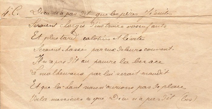 Zeer vreemd antiklerikaal manuscriptlied uitgegeven door "Boileau d'Avignon, poet-chansonnier" in 1877 in "Chansons, Poésies et Satires Républicaines", Avignon, Imprimerie Administrative de Gros Frères, 1877.