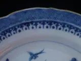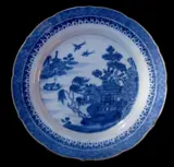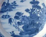 Prachtig bordje in kobaltblauw beschilderd porselein met voorstelling van een pagode in een Chinees landschapje.. Rand gehoogd met geelbruin email.