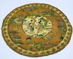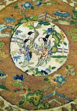 Een zeldzaam en prachtig klein Chinees borduurwerk, voorstellende Chinese vrouwen in het dagelijks leven omringd door bomen en huizen, allemaal prachtig bewerkt,
