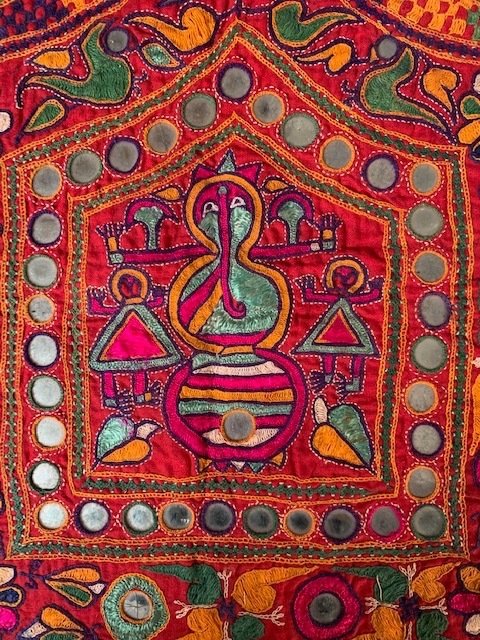 Techniek: katoen, met de hand geborduurd, spiegeltjes.
