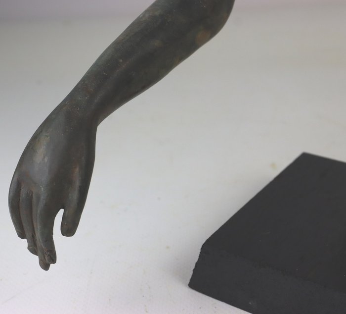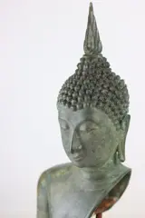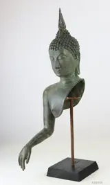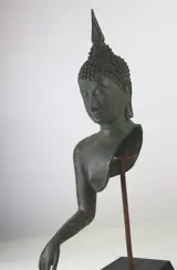 Bronzen Sukothai stijl Boeddha hoofd uit het Koninkrijk van Thailand.Het is handgemaakt in de traditionele ' Lost Wax ' methode. Het gezicht is ovaal met gebogen wenkbrauwen, Aquiline neus, zwakke glimlach, langwerpige oor lobben en gekruld haar met een vlammende "Ushnisha", De buste is permanent gemonteerd op een massiefhouten blok