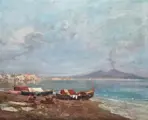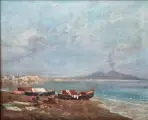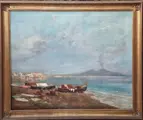 Olieverfwerk op doek voorstellende een kust in Napels met boten en vissers, rechtsonder gesigneerd "C.Brancaccio Paris".