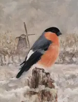 Een prachtige Goudvink in een hollands winterlandschap met op de achtergrond een molen