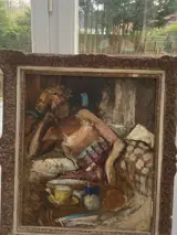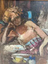 Olieverfschilder op paneel met een jonge vrouw die aan het ontbijt zit.