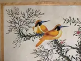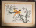 Voorstellend twee geel gekleurde vogels, zittend in takken.