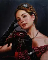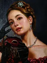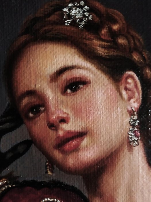 De foto, geschilderd met een realistische techniek, toont een dromende vrouw, gekroond met juwelen en verborgen door een pas gevallen masker. De kleur en het licht suggereren een mysterieuze en melancholische sfeer die een dromerige sensatie oproept.