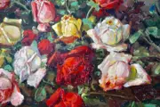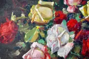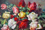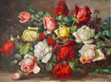 Constantin Paun (Roemeens, eind 19e eeuw - begin van de 20e eeuw), Europese School (XIX - XX), "Rozen", Olie op karton. Gesigneerd in bruin, rechtsonder. Het werk bevindt zich in een zeer goede staat van bewaring, met weinig tekenen van veroudering rond de randen (zie gedetailleerde foto's).