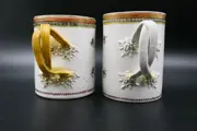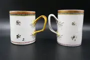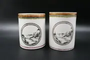 Een paar Chinese geëxporteerde mokken. Het havengezicht en de bloemen zijn geschilderd met inktkleur. Vijf verschillende patronen langs de mondrand, beschilderd met wit, zwart, goud, groen en wit email.