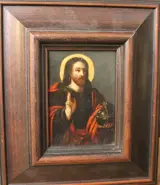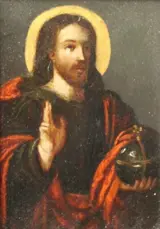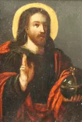 Interessant schilderij van een Salvator Mundi die de wereldbol vasthoudt.
