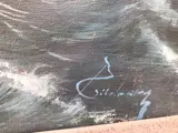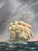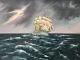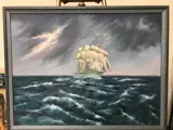 Driemaster zeilschip in stormachtige tot ruwe zee nabij kust (meeuwen)