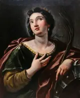 Hoewel de compositorische karakters duidelijke stilistische kenmerken van Vlaamse oorsprong verraden, herinneren ze aan de resultaten van de Bolognese school van de zeventiende eeuw. In feite verwijst het doek naar een handschrift tussen neomaniëristisch en neoclassicistisch afgeleid van de Carraccis in het eerste decennium van de eeuw, met verwijzingen naar het cangiantisme van Denys Calvaert, bekend als Dionisio Fiammingo (Aversa, 1540c. - Bologna, 1616). Een goed antwoord vinden we bij de prachtige Santa Cecilia, uitgevoerd door de Italiaans-Vlaamse meester omstreeks 1580. (olie op canvas, cm. 161x117.5), geconserveerd in de National Gallery van Parma, en object van verschillende replica's: Galleria Pallavicina van Rome; Casa d'Asta Hampel (kavel, 155, olieverf op doek cm. 161x117, München Duitsland, 2012, schatting € 40.000 – 60.000), en Porro & C. (kavel 222, olieverf op doek cm. 150x115, Milaan, 2006). Het doek in kwestie is duidelijk afgeleid van deze uitvinding van de meester, en de figuur is eenvoudig aangepast aan de heilige Catharina door haar handen lichtjes te bewegen en het tandrad op te nemen, een teken van haar martelaarschap. Verwijzend naar het model van Santa Cecilia zet de Vlaamse kunstenaar in feite de toon met de bijna volledige figuur die de hele ruimte inneemt en zijn linkerhand op zijn borst draait, terwijl hij zijn blik met grote donkere ogen naar de lucht richt , met een uitdrukking die bijna grenst aan loomheid. Net als in de Santa Cecilia van Parma en in de andere replica's gaat Calvaert over op een sensuele en extatische interpretatie volgens het nieuwe contrareformatorische vroomheidsideaal van die tijd. De zeer nauwkeurige manier, de schittering van de kleuren, de details van het tandrad en het licht geven een grote charme aan dit krachtige en tegelijkertijd lome beeld.