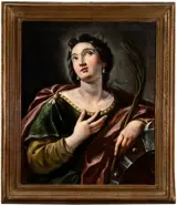 Interessant oud schilderij, gekocht op de antiekmarkt en in eerste instantie verwezen naar de school van Guido Reni. Het schilderij illustreert een van de bekendste scènes die verband houden met de cultus van Sint-Katelijne, vaak genoemd als een thaumaturg in oude literaire bronnen, met name in de Gouden Legende van Jacopo da Varazze. De tekst spreekt over de jonge Catherine (287-305 n.Chr.), een christelijke heilige en filosoof, volgens de legende geïdentificeerd als een aristocratische telg van een prins van Egypte. Zijn buitengewone oratorische vaardigheden, intelligentie en geloofscultuur werden gemeten tijdens de viering van de komst van de consul Gaius Galerius Valerius Massimino Daia, de nieuwe gouverneur van de provincie. Omdat ze weigerde zich te buigen voor openbare heidense offers en afstand te doen van haar geloof in Christus, werd Catherine gedwongen tot een openbare discussie over de dogma's van het christelijk geloof met de wijzen van de stad: het jonge meisje bekeerde ze allemaal. Gemarteld op het gewapende wiel om haar openbare afzwering te verkrijgen, werd het meisje gered door de engelen die het instrument van het martelaarschap braken. Maximinus zag zich daarom genoodzaakt de onthoofding te bevelen. Meer dan die van andere christelijke martelaren had het verhaal de illustere volgelingen van de katholieke reformatie gefascineerd: de jeugd, de aristocratische elegantie van de ongemakkelijke vierde-eeuwse geleerde, vermoord omdat ze publiekelijk haar geloof bevestigde, werden de kenmerken van een alom gevierde sekte door de schilders, voor wie