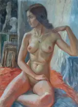 Naakt in het atelier - olieverf op doek, gesigneerd linksonder en verso getiteld in het Russisch.