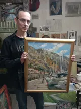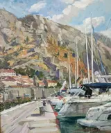 Jachten in de baai van Kotor. Montenegro - olieverf op doek, linksonder gesigneerd en in het Russisch op de achterkant.
