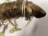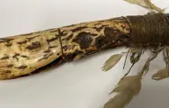 Originele band en decoratie (kasuarisveren) nog aanwezig. Gemonteerd op statief.