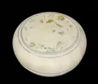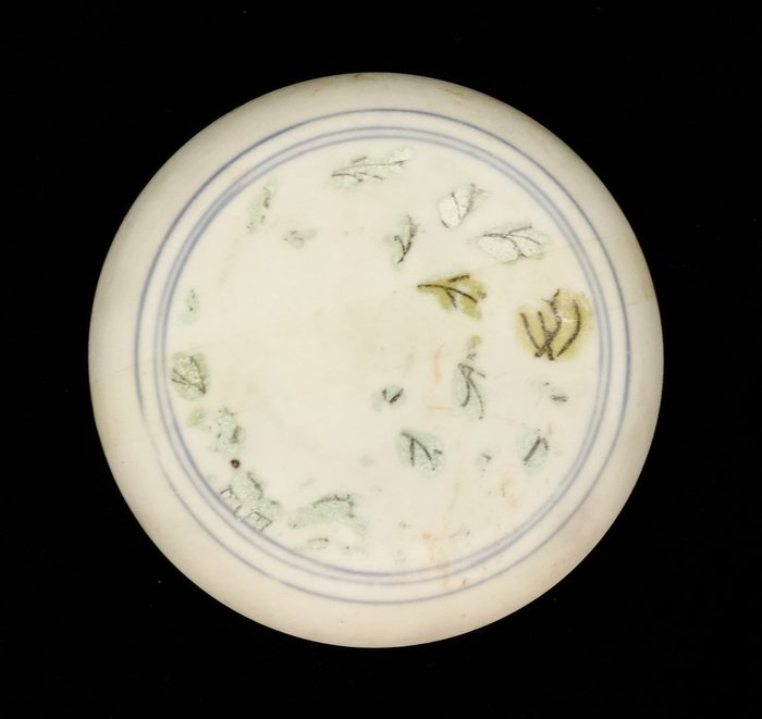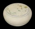 Porseleinen parfumdoos bedekt met een wit en blauw glazuur, waarvan het deksel is versierd met bloemmotieven