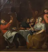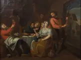 Kostbaar schilderij op canvas, voorstellend een huiselijk tafereel.