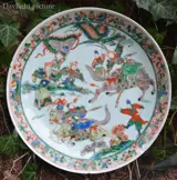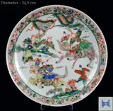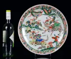 Grote Chinese porseleinen famile verte "Warriors" ondiepe kom (of schotel). In de stijl vroege Qing-dynastie, Kangxi-periode (1662-1722), eind 17e eeuw maar waarschijnlijk 20e eeuw. Een zeer zeldzaam voorbeeld van hoogwaardig servies.