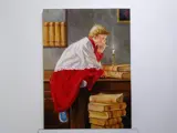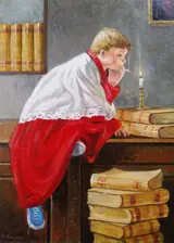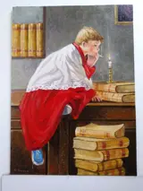 -Werk opgelost met de techniek van olieverf, felgekleurd, die het mooie tafereel voorstelt, de misdienaar alleen in de sacristie.