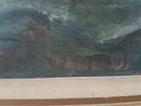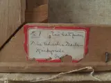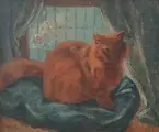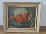 Schilderij van Emily Rutland, kunstenares geboren in Texas, voorstellende een rode kat op een groen kussen voor een raam en gordijnen. Het is een olieverf op doek die schoongemaakt zal moeten worden. Het canvas heeft een afmeting van 49,5cm x 39,5cm zonder de houten lijst. Het is gesigneerd door de kunstenaar. Er is een wit spoor, van onbepaalde aard, zichtbaar op de foto's. Er is ook een kleine uitsparing rechts van de kop van de kat, maar die is niet te zien als je van voren naar het schilderij kijkt. Op de achterkant van het houten frame zit een label met de inscriptie "No 1 Red Cat ???, Charles Martin, Kirbyville, ???.