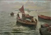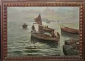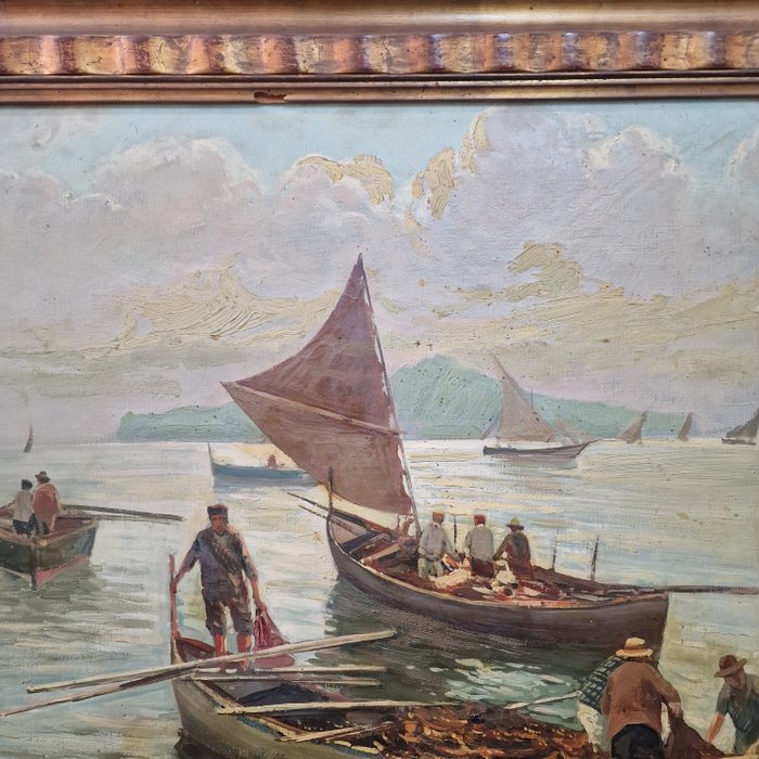 Olieverf op doek met afbeelding van de jachthaven van Napels met boten en vissers, gesigneerd E.Costa linksonder.