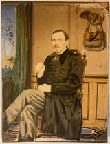 Een schilderij op papier van een man die in het jachthuis zit.