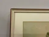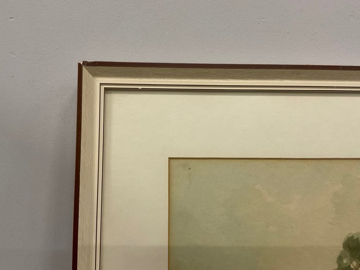 Ingelijst met witte met bruine lijst, passe-partout en achter glas.